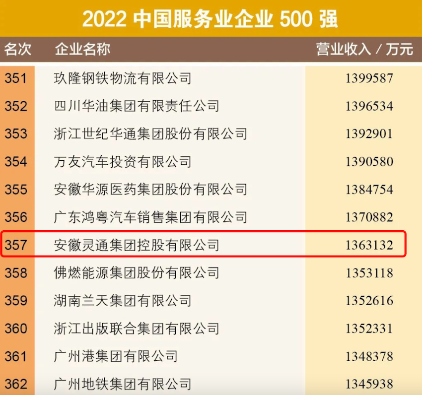 9月6日,中国企业联合会、中国企业家协会联合发布了“2022中国企业500强”、“2022中国服务业企业500强”等名单。安徽灵通集团迈进中国服务业500强,位列第357位。
